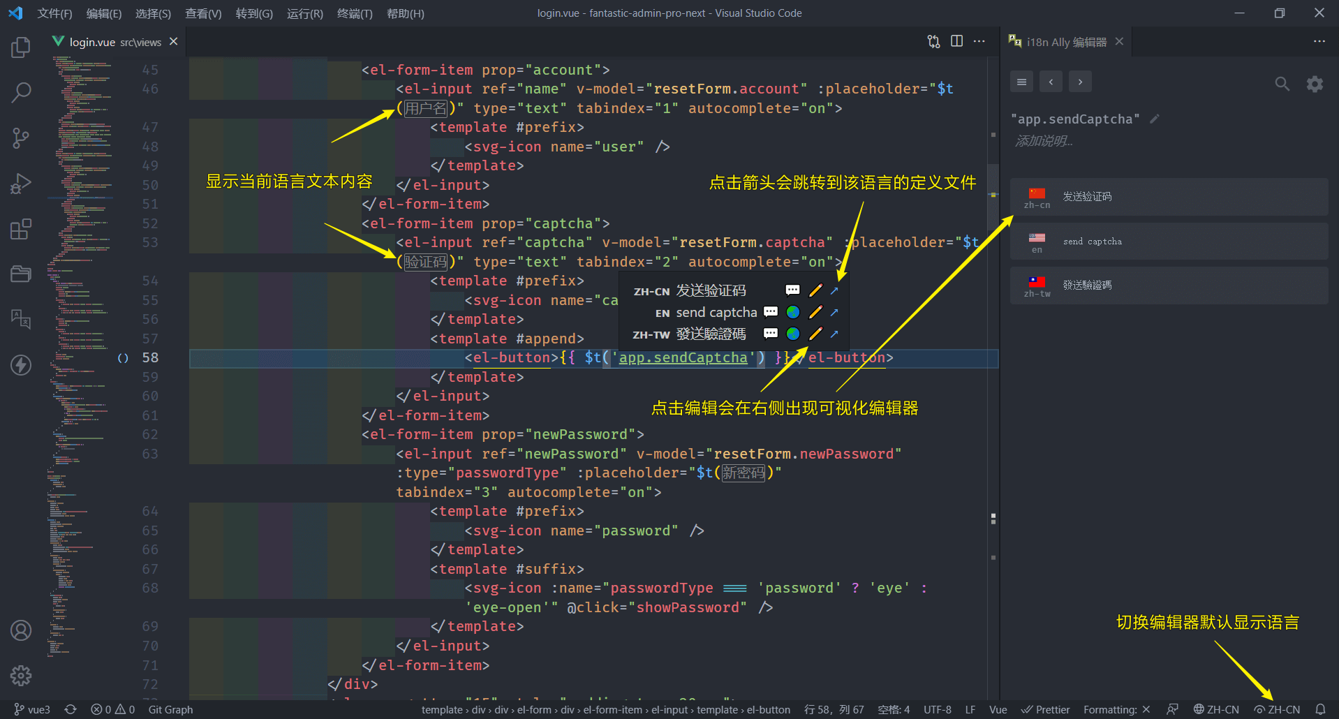 如果使用 vscode 进行开发,推荐安装 i18n Ally 这个扩展。