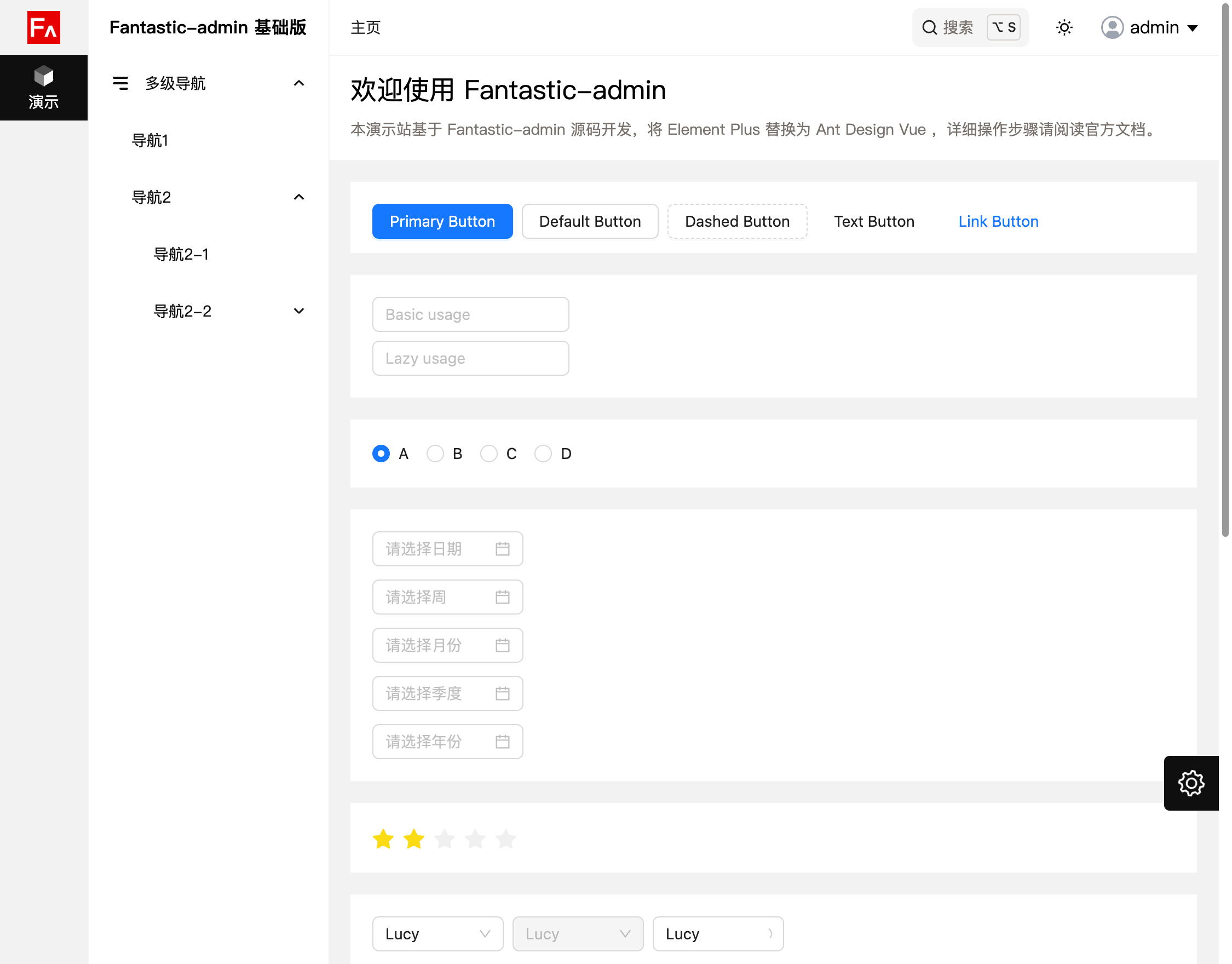 由于框架默认使用的是 Element Plus 组件库,并且演示源码中大量示例也使用了 Element Plus,如果你需要使用 Ant Design Vue,请拉取框架源码分支,或者到 Github Releases 页面下载框架源码压缩包。