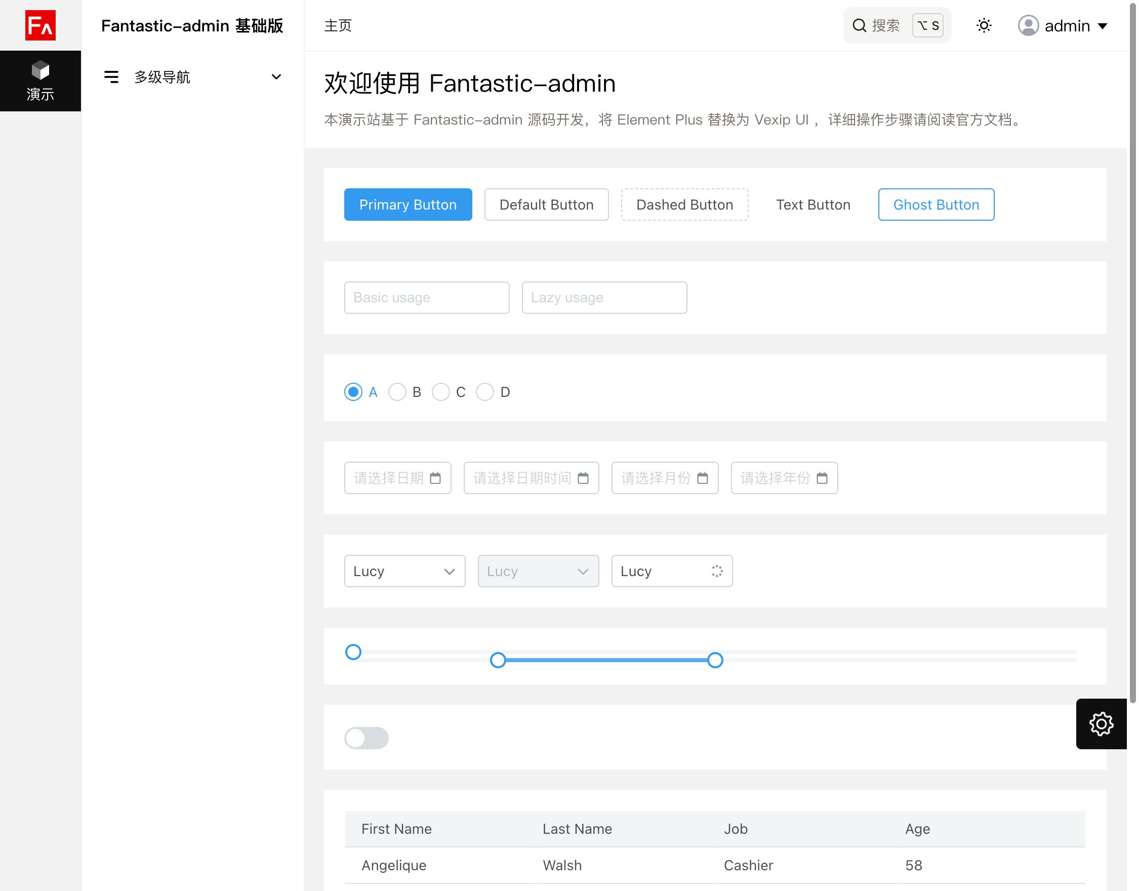 由于框架默认使用的是 Element Plus 组件库,并且演示源码中大量示例也使用了 Element Plus,如果你需要使用 Vexip UI,请拉取框架源码分支,或者到 Github Releases 页面下载框架源码压缩包。