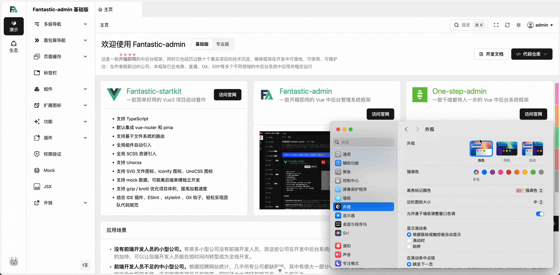 提供了 8 套主题,每套主题都支持明亮和暗黑两种模式,并且主题支持在运行时共存,可实现动态切换。