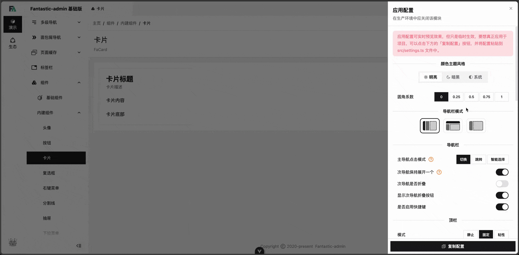 }该设置会影响到框架中所有圆角组件的圆角系数,例如按钮、卡片、弹窗等。